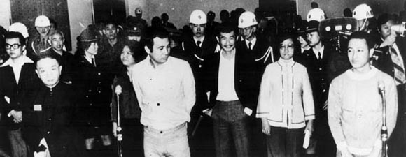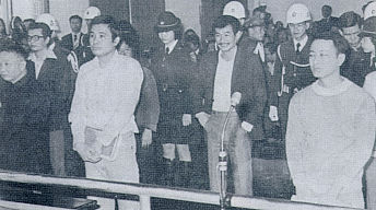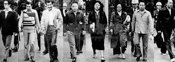 美麗島事件審判庭.--左起黃信介、張俊宏(戴眼鏡者)、姚嘉文、陳菊(姚後,只有三分之一)、永遠笑嘻嘻的施明德、林弘宣。