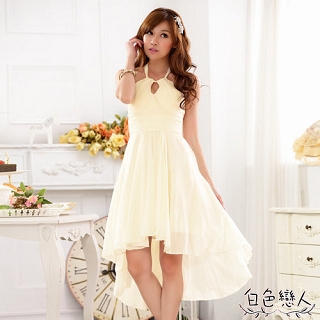 今夏流行款!【白色戀人中大尺碼】香檳色前短後長收腰連衣裙 推薦