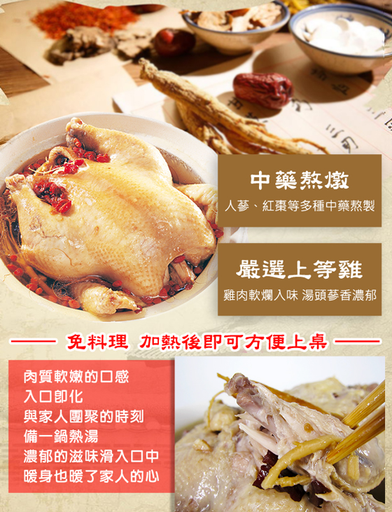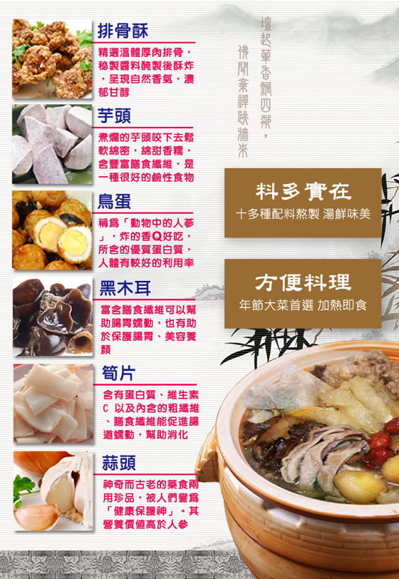 佛跳牆(1000g/份)/陳紹醉蝦(400g/份)/櫻花蝦米糕(65gx6個)/鮑魚風味雞(2000g/份)/金棗雞腿捲(350g/份)/蒲燒鰻魚(170g/份)