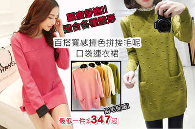只要388元起,即可享有百搭寬感撞色拼接毛呢口袋連衣裙/保暖舒適蕾絲花邊領長版毛衣〈任選一入/二入/四入,多種顏色可選擇〉↓↓↓限量特惠的優惠按鈕↓↓↓