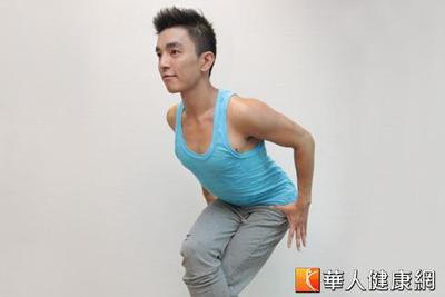 維持這個姿勢,深呼吸身體向上,吐氣身體向下,肚子要用力,同時間感覺大、小腿收緊用力,一邊至少做10下讓大腿有痠麻感,若可以負荷加強到12~15下,接著換邊操作,動作要領同上。