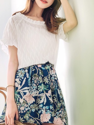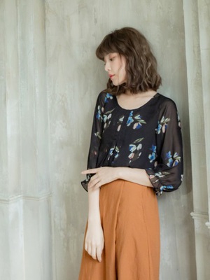 【本周刷卡優惠】滿版花朵胸前壓褶荷葉袖雪紡上衣-好康偷偷說