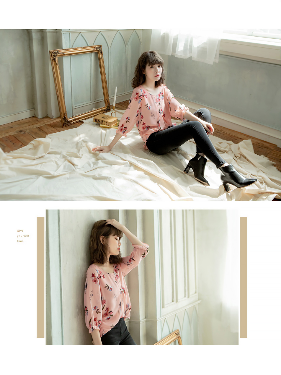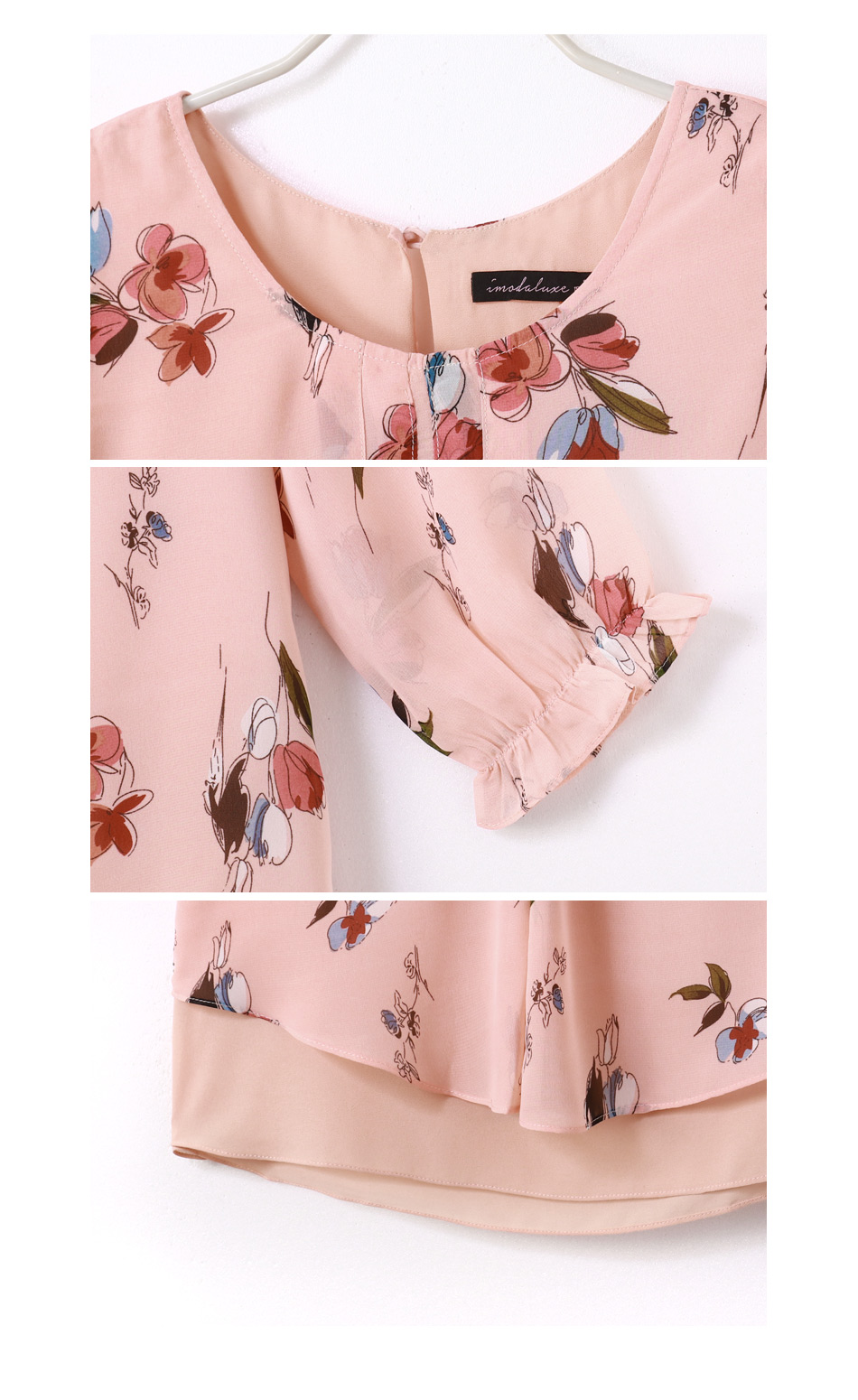 【本周刷卡優惠】滿版花朵胸前壓褶荷葉袖雪紡上衣-好康偷偷說