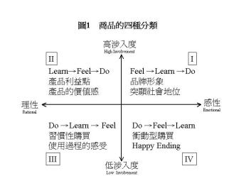 在行銷學上,根據感性理性和高涉入度低涉入度這兩條垂直軸,我們就可以將商品分為四類,如圖1所示。在圖1中每一個象限都代表一類商品,每一類商品都有其獨特的使用歷程,在溝通策略的形成上也有其特定的切入點,例如第IV象限低涉入度感性商品,其商品的學習歷程是Do →Feel→Learn,屬於衝動型購買,在廣告溝通上最好是遵守Happy Ending的法則,表現出商品使用後的心情感受,食品飲料是最典型的第IV類商品。所以,我們看到很多這類商品的廣告都是很誇張,好像吃了這類商品後可以飛天鑽地,也讓創意能夠有非常大的發揮空間。例如,有一個零嘴叫做「什麼玩意兒」的,吃了竟然可以在心理上報仇,大聲罵上司「豬頭」並詛咒之。像統一的C多系列,表現也非常超現實的生活化,吸了蘋果汁後雙頰馬上變紅人也變得亢奮。