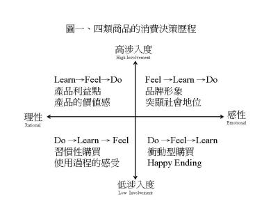 在第I象限,屬高涉入度理性商品,是先Feel然後Learn再Do產生購買行動,因此這類商品的品牌形象相當重要,像汽車的品牌應該就是落在這個象限,先對某一品牌有好感後,要購買(Do)之前還是會去仔細看看(Learn)。第二象限,則為高涉入度理性商品,先Learn然後Feel再Do,其程序與AIDA相當一致,像機車品牌應該就是屬於這一類,強調其產品功能可帶給消費者怎樣的消費利益點。第三象限則為低涉入度理性商品,先Do然後Learn再Feel,通常日用品品牌屬於此類,強調使用過程的感受,所以像洗髮乳的TVCF廣告,都會來一段幾秒鐘洗頭的画面,原因也在此,勾起消費者的感受。第四象限則為低涉入度感性商品,先Do然後Feel再Learn,就是一般所謂的衝動型購買,像食品飲料就屬於這類商品,強調Happy Ending,表現在使用或食用後的心情感覺,所以這一類的商品在廣告創意上有很大的發揮空間,只要找到商品帶給消費者的利益點為發想點,廣告表現就可以飛天鑽地盡情發揮。