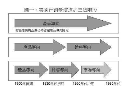 世事多變化,故有滄海桑田之說,曾為茫茫一滄海,而今卻已成一畝畝的桑田,當然是喻世間事之變化,也就是說世間的人事物沒有不變者,此乃自然之現象,而關於行銷的事又何嘗不是如此呢?打開行銷學課本,剛好在美商麥格羅‧希爾(Mc Graw Hill)行銷系列叢書中的一本「行銷學(Marketing)」第12版,作者:Michael J. Etzel‧Bruce J. Walker‧William J. Stanton,審閱:黃營杉教授,麥素蓮譯,2001初版。在這本書的第8頁有一張圖,談到美國行銷學演進的三個階段,如圖一所示。雖然這是美國那個地區的行銷演進階段整理,也只是整理到1990年代,但這樣的行銷演進的結構應該也是適用於台灣這個地區的市場,也許其差異也只是在最下面的時間軸會有一些落差罷了,尤其是在台灣市場的自由化和國際化之後,就現在2008年的狀況,推測台灣市場在時間軸上應該不會有落差,也就是說圖一越往右邊的那一部份,也是台灣的行銷學走勢。
