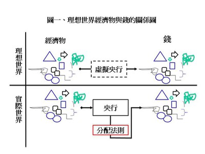 其實這個問題相當地簡單,就是要導入一個「虛擬央行」的概念,這個「虛擬央行」可說是神通廣大,百分之百非常地精準,那就是在一個經濟體中被消費的「經濟物」有多少價值,這個「虛擬央行」就發行多少「錢」,若這些被消費的「經濟物」越多,則這個經濟體就會越有「錢」,所以,重點不是「虛擬央行」可發行多少錢,而是一個經濟體能產出多少被消費的「經濟物」,有的「經濟物」消費完了就消失了,一下子就沒有其價值了,如吃的喝的,有的「經濟物」消費時間會久一點其價值才會消失,如汽車,還有一些「經濟物」消費了隨時間還可增值的…,總之各種形形色色被消費的「經濟物」之總和,這個「虛擬央行」就要發行相對等價值的「錢」,當這些「經濟物」被消費變少了,那「虛擬央行」就會把「錢」收回來,「虛擬央行」就是有這個能耐可百分之一百維持被消費的「經濟物」與發行「錢」之間的對應關係,這是一個非常理想的世界,如圖一所示,而相對應於這個理想世界的實際世界,相對應於「虛擬央行」的央行,當然就沒有這樣的理想能耐了,幾乎不可能維持「經濟物」與發行「錢」之間的百分之一百對應關係,所以才會有通貨膨脹,或是通貨緊縮,經濟泡沫化…等經濟事件,在此就不再深論之。