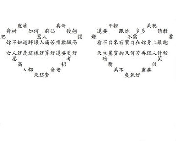 女人因愛情而變得美麗 男人因美麗而了解愛情 女人因愛過而不怕困境 男人因困境而承認愛過 女人因敏感而相信直覺 男人因直覺而漸漸敏感 女人因家庭而放棄誘惑 男人因誘惑而遠離家庭 女人因承諾而付出所有 男...