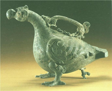 127禽,活捕野獸的獵網 銅絞鍊蓋鳥形酒尊高25.3公分春秋,西元前八至前五世紀。 甲骨文有一個字,字形有兩種結構;一作(),是一種有長柄的工具形象;一作(),是這種工具拿在手中之狀。此字的意義為擒獲...