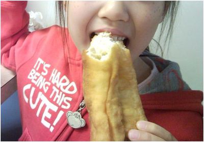 姪女啃著超紮實的炸油條!吃起來有點像麵包!不像台式的空空的像在吃空氣!但台灣的比較香、酥!這種的沾皮蛋廋肉粥、豆漿或湯類最棒!因為會吸滿飽飽的湯汁!