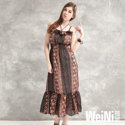 【WeiNI薇妮】碎花綁繞脖平口雪紡洋裝(黑色)