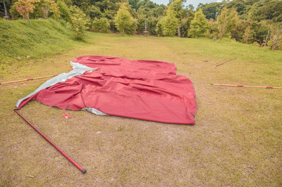 (1)營繩放鬆,前庭柱營柱放下來收好營柱,營釘,營繩在收納袋裡。