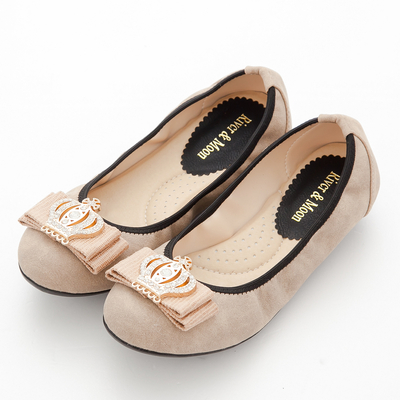 River&Moon台灣製水鑽皇冠朵結厚切乳膠彎曲娃娃豆豆鞋-卡其