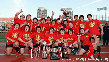 32分鐘: 帝京大6號大和田立達陣,10號森田佳寿轉換攻門成功.12-7 (上半場比數)