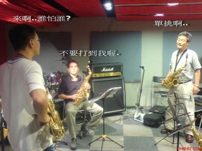 ^_^”...這照片本來是許大哥和Lion在聊薩克斯風的問題..但我拍時看姿勢蠻自然的,所以加上Kuso的旁白...感覺就不一樣了吧...尤其是中間鐘老師的表情,那句對白很適合他...哈哈哈.... ...