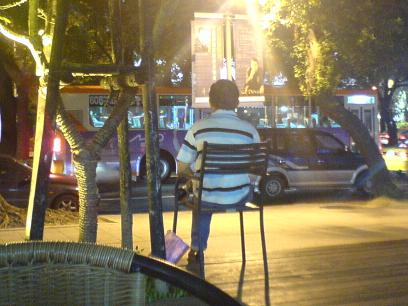 我習慣坐在這,但一次只面對一個角度,在雙眼可視的範圍往前看,以此視角為舞台,演員們在我面前上台,下台,沒有出將入相這種死硬規定,即興的演出, 眼前這男人,禮貌性的詢問後取走我身邊的椅子,便自顧自的搬到路邊去喝著飲料,抽起了煙,不在人群中污染,在不影響別人的情況下,得到自己的悠閒,就像舞台上的演員突然和我這個觀眾有了互動,隨即又回到了舞台上,繼續他的演出,看著他的背影,我微微一笑,被隔壁燻的一肚子氣,也消了,是時候回家了...