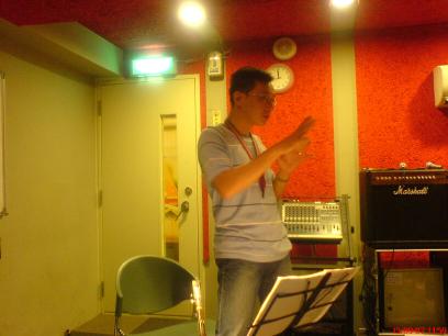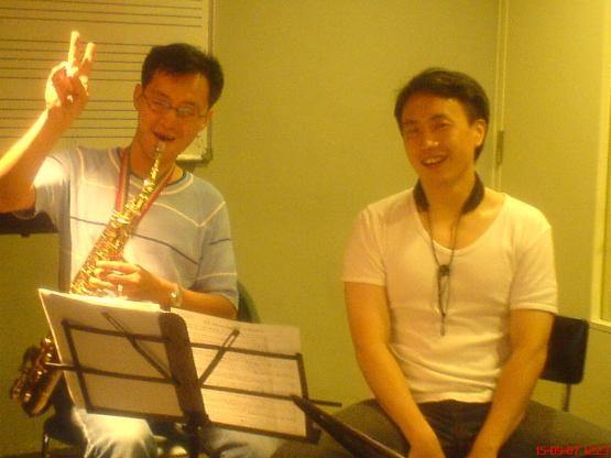 搞笑了那麼多張照片,來張認真的表情好了,省的有人說我練團都在玩,沒認真練,這張是Lion在拍Alex的薩克斯風時,某個角落剛好把我整個”大頭”都拍進去了,用軟體將那個角另外格放,所以解析度普普,不過”鐵面人”是真的..