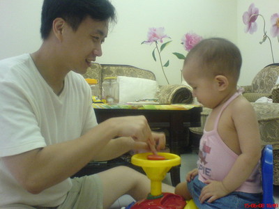 P.S.7. 好幾次..當我用手機拍那兩個小ㄚ頭並引起她們注意的時候,會把手機的拍攝畫面調整好交給NANA,讓她學著捕捉畫面,因為那是學習繪畫的第一步,這是她第一次拍照,我在逗著小CC,她應該是差不多兩歲,而NANA大她四歲,六歲的孩子拍的照片,雖然我有點出鏡,但她已經退到櫃子邊沒辦法再退,至少把她妹妹拍的很完整,看起來很自然..可以接受了..