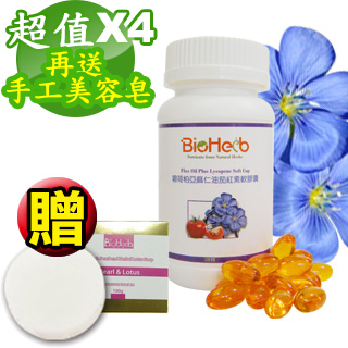 【碧荷柏】亞麻仁油茄紅素軟膠囊(30顆-瓶 4入組 加贈 手工美容皂)