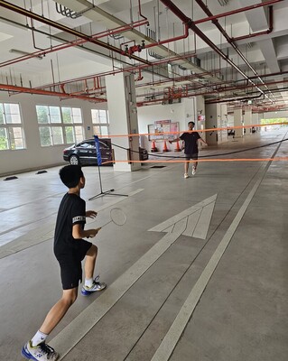 20250831假日球場 假日時光不離運動........... 公所車庫充當球場........... 羽球啟蒙回到最初........... 時空跨越兄弟兩人..........