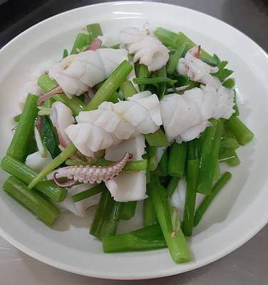 20220101芹管鮮魷 逛市場買來芹管兩把.......... 纖維多又有青脆口感.......... 透抽太貴找小卷充數.......... 個頭大點其實也差不多........