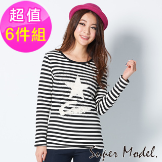 【名模衣櫃】型-橫條印花上衣6件組(M-L)