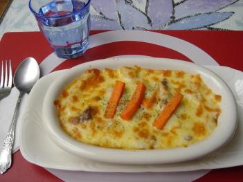 這道菜的誕生也是巧合。大家或許都曾耳聞咖啡館的廚房總會有幾道不見客的私密料理,而且經常是意想不到的美味。其實說穿了,也就是廚師們利用手邊現成的餐點重新組合,弄給自己人吃的隨性作品。因為隨性所以創意沒有限制,往往會有令人驚喜的餐點就此推出。想吃招牌的紅酒燉牛肉,又想吃義式筆尖麵,又想吃熱騰騰的焗烤起司時,這道菜的概念就這麼自然而然浮現了。希望您也會喜歡這道原本只能在卡夫卡廚房享用的創意料理
