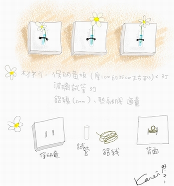 [作法] 1.剪裁下厚1cm的保麗龍3個。 2.利用熱融膠or保麗龍膠將試管固定在保麗龍上。 3.在黏好試管的兩旁平行割下約1.5cm的長條洞。 (保麗龍上方算下來10cm處割長條洞,即...