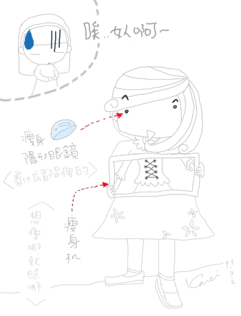 [文字] 一副瘦身隱形眼鏡,給全世界所有的人帶上,這樣在大家的眼裡就沒有瘦子與胖子的分別。 如果沒有瘦身隱形眼鏡,那來一台瘦身機也不錯,想瘦那裡就照那裡,但僅維持一小時應該不夠用,要再延長...
