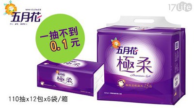 紀念日禮物商品訊息特點只要799元(含運)即可購得【五月花】原價1380元極柔頂級抽取式衛生紙1箱,每箱內含:110抽x12包x6袋。