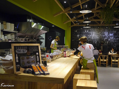 這次,沒讓我失望。一踏進The V:F店家,先注意到亮眼的綠色及溫暖淺色原木家具,連每位負責餐點的廚師也有著相同的氛圍,個個身披綠圍裙且年輕有活力。