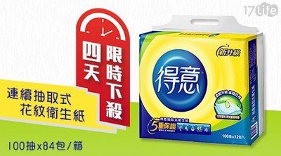 在這裡購買限時下殺!得意連續抽取式花紋衛生紙(100抽x84包) 有限時折扣優惠,趕快跟大家分享這個好消息
