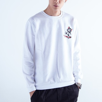 【限時產品】潮流滑板貓咪刷毛長T(白色) 502 網友一致推薦熱銷