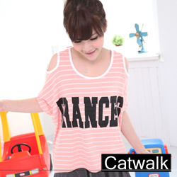 【Catwalk】陽光橫條紋露肩彈力寬棉T (共二色) 觸感極為柔軟舒適的超彈力棉料 不對稱式前短後長的衣襬設計率性又自然 增加女孩性感氛圍的挖洞露肩造型 大大的FRANCES英文字母休閒感十足 打造陽光活力模樣的配色橫條紋 讓妳任意穿搭出屬於自我的年輕風格