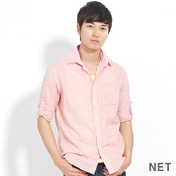 【NET】男素/格紋七分袖襯衫 (橘紅) 料號:25330 純棉質感舒適好穿 ! 豐富色款任您挑選 !