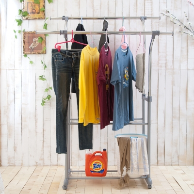 雙桿衣架採加長伸縮設計,雙桿設計讓您方便收納更多衣物,DIY組裝,組立容易,使用方便,附4顆輪子,移動性佳,小巧不占空間,租屋族最愛!增設鐵網片,收納再升級!