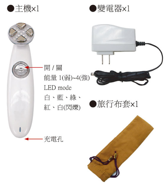商品內容:主機x1、充電變電器x1、旅行布套x1