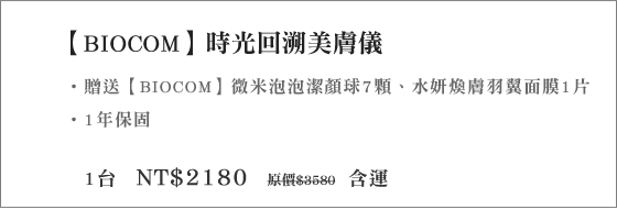 商品訊息簡述: 只要2180元(含運)即可購得【BIOCOM】原價3580元時光回溯美膚儀1台,買就送:【BIOCOM】微米泡泡潔顏球7顆、水妍煥膚羽翼面膜1片!