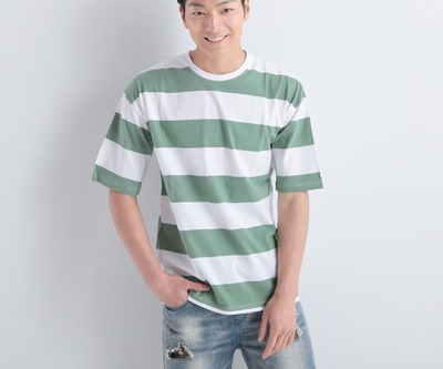最近在購物網上看到韓風休閒條紋落肩棉短T (綠色) 226