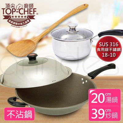 購買! 限量不等人的【頂尖廚師 Top Chef】鈦合金頂級中華39公分不沾炒鍋 贈和風木匙(搭316不鏽鋼雪平油炸鍋)的限時折扣