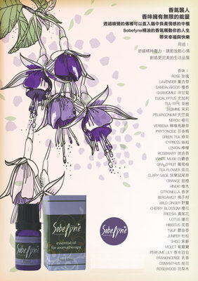 ?sobefyne,自歐洲法國進口原產精油,有玫瑰、薰衣草、檀香、洋甘菊、尤加利、茶樹、茉莉、天竺葵、橙花、檸檬馬鞭草、芬多精、綠茶、私柏、檸檬、迷迭香、白麝香、葡萄柚、茶花、快樂鼠尾草、甜橙、檜木、香茅、佛手柑、野薑、櫻花、鳶尾花、蓮花、芙蓉、鬱金香、杜松、紫蘇、紫羅蘭、香水百合、乳香、桂花、花梨木,共計三十六種可供選擇,可依照不同環境與喜好使用。