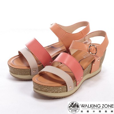 momo網 超CP值婦幼品 運動好物推薦分享【WALKING ZONE】三色搭配扣環式楔形厚底涼鞋(桃) 周末特價