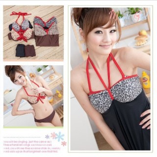 • sexy的豹紋花色比基尼 加上綁脖的平口洋裝