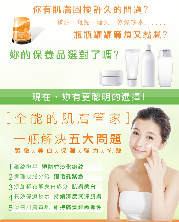 使用方式:清潔肌膚後或使用化妝水後,取適量均勻塗抹於臉、頸部位,並以指腹輕加按摩至吸收。