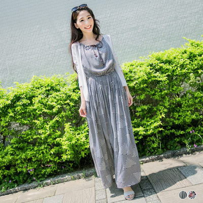 田園時尚~條紋/絢爛印花麻花皮繩綁帶長洋裝.2色