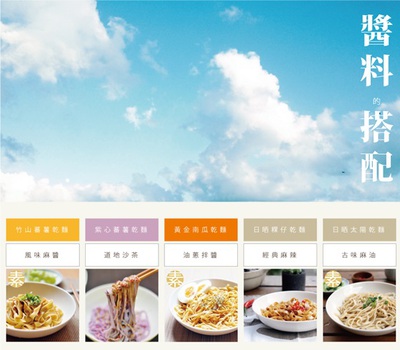 商品:黃金南瓜乾麵(油蔥)/紫心番薯乾麵(沙茶)/竹山蕃薯乾麵(麻醬)/日曬粿仔乾麵(麻辣)/日曬太陽乾麵(麻油)/鮮綠菠菜麵(椒麻)