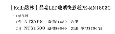 團購 Kolin歌林-晶亮LED玻璃快煮壺(PK-MN1803G) 宅配24小時快速到貨、還有用品、折價優惠券、17Life即買可即享用,對我這個急性子的人真好!ok忠訓國際