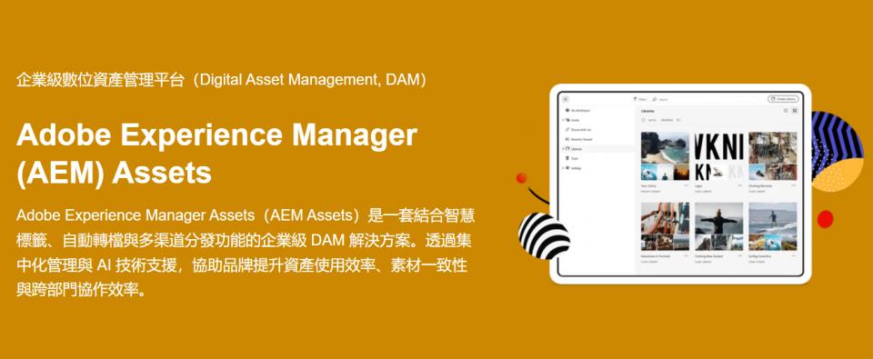 Adobe Experience Manager Assets(AEM Assets)是一套結合智慧標籤、自動轉檔與多渠道分發功能的企業級 DAM 解決方案。透過集中化管理與 AI 技術支援,協助品牌提升資產使用效率、素材一致性與跨部門協作效率。