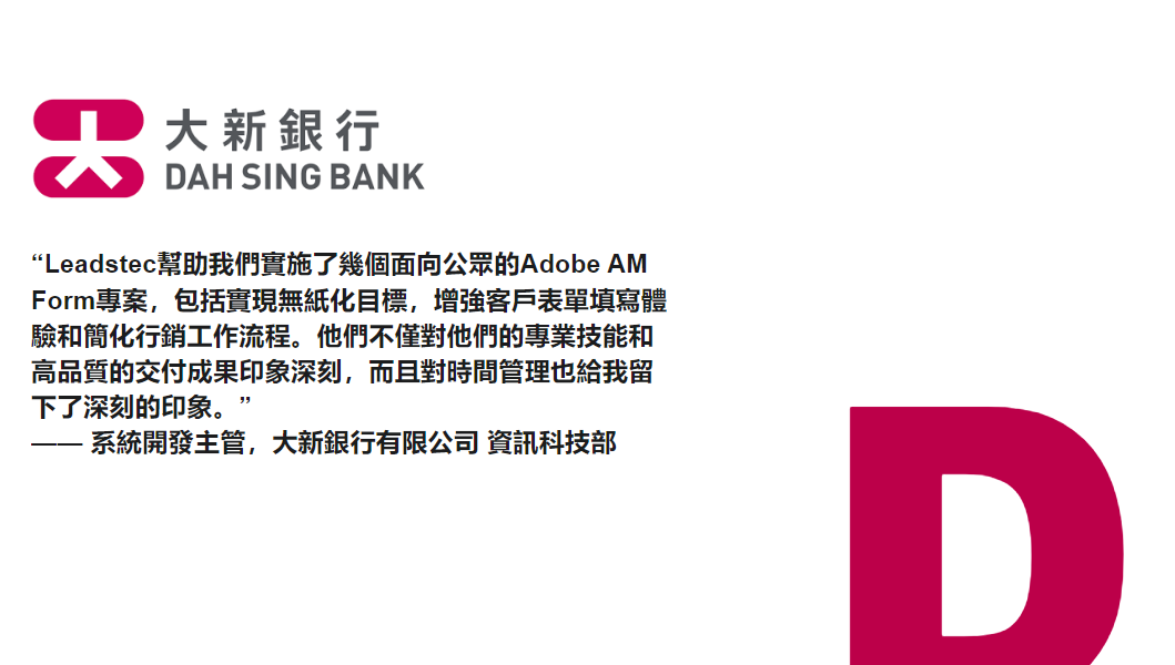 協助銀行客戶導入 AEM Forms,實現信用卡和個人貸款的電子申請表單,平均處理時間縮短60%,前台填寫錯誤率下降超過40%。