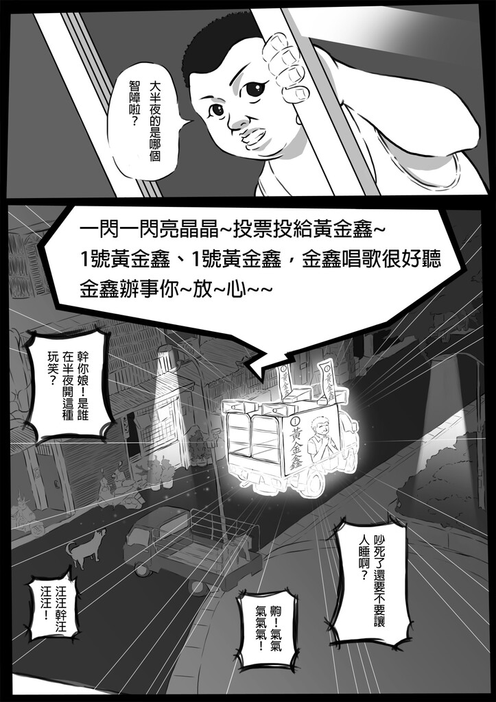 但這就在大華叔決定出來參選後,姓黃的行為才終於有了極大的變化。但那種變化不是像一拳超人那樣開啟認真模式開始里民服務,而是砸錢買宣傳車、製作選舉旗幟,還找人寫競選曲子親自演唱,只是選個里長卻把自己搞得像在選總統一樣風光,至今我還記得他的宣傳口號:「一閃一閃亮晶晶~投票投給黃金鑫~1號黃金鑫、1號黃金鑫,金鑫唱歌很好聽、金鑫辦事你~放~心~~(高分貝破音)」